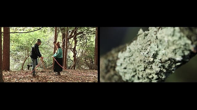 Umbilicaria, 2025 cotton rope, dye, bleached wheat flour, cornmeal, dimensions variable video projection 19:11
